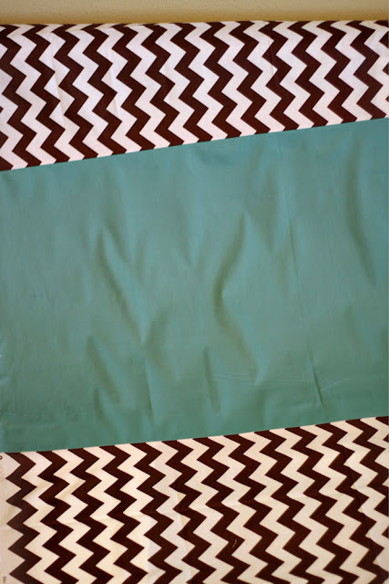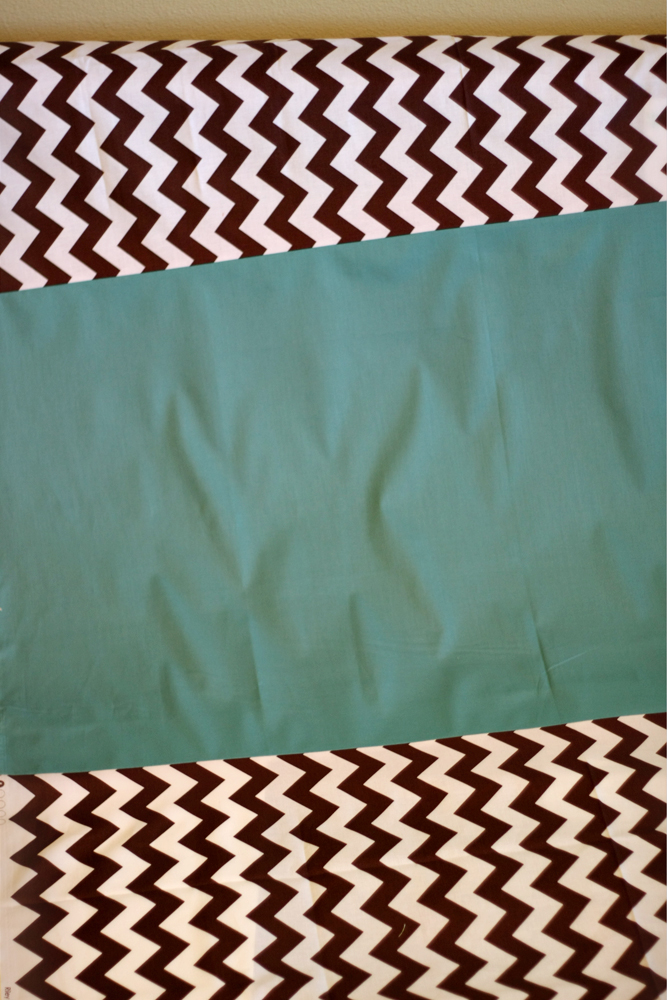 Preparing your backing. I didn’t have quite enough of the zig-zag fabric to cover the whole back, so I cut it in half and added a strip of solid fabric.You could just as easily use a solid cut of fabric {you would need 1 3/4 YD}.