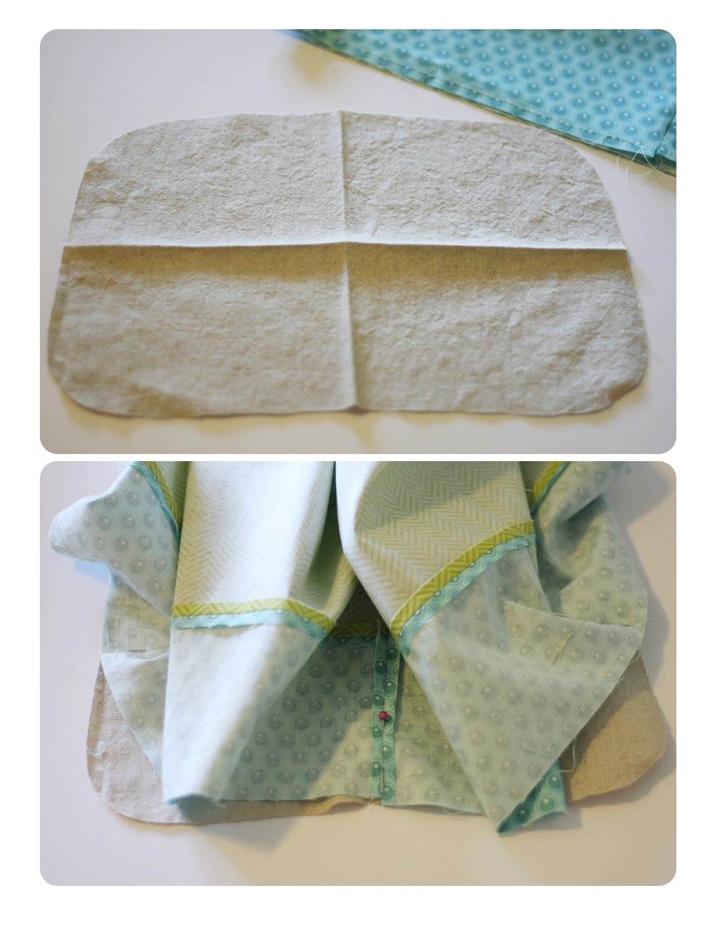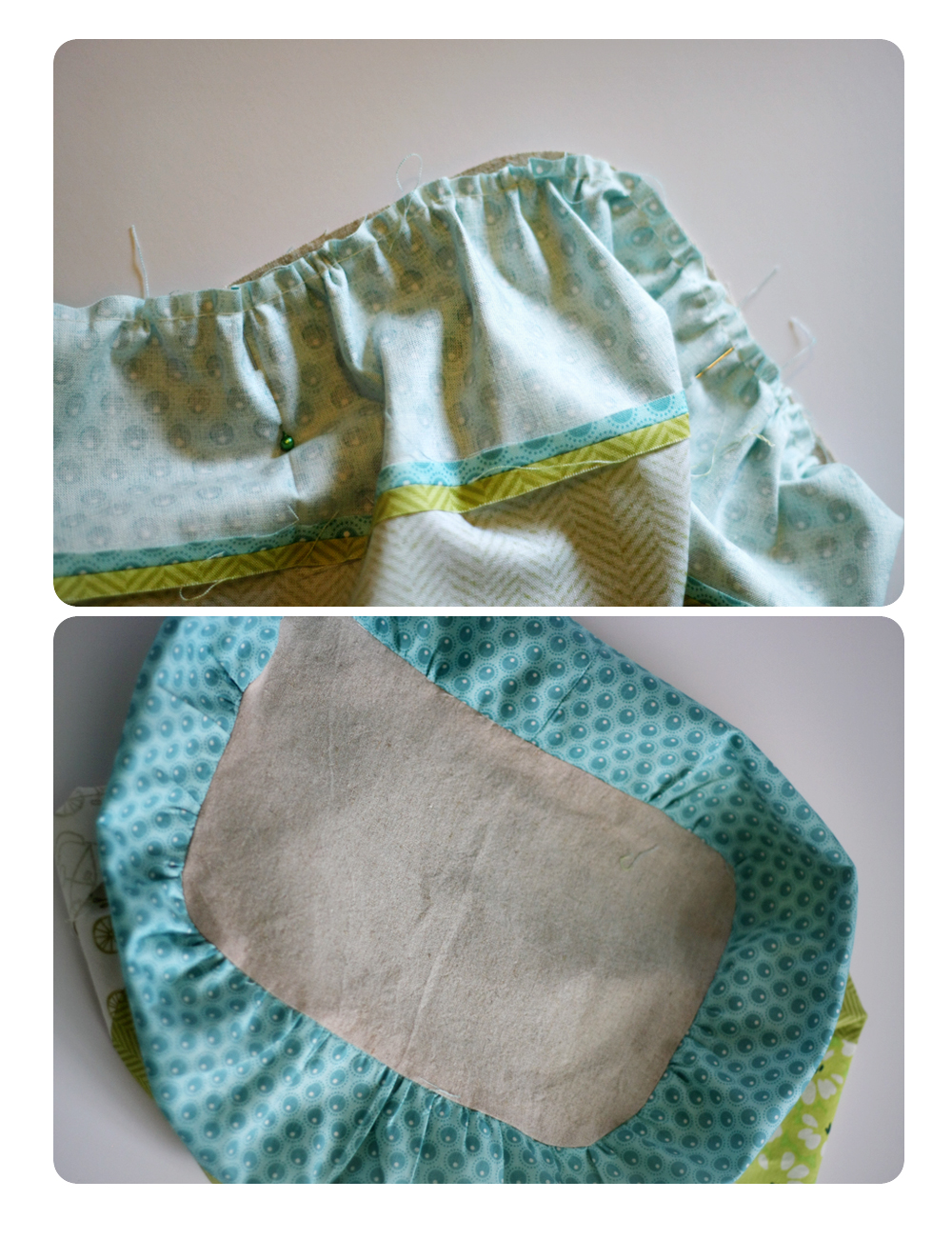 Pull the bobbin thread of the basting stitch and distribute the gathers until the panel matches up with the base. Pin in place and sew together using a 1/4″ SA. {Note: I gathered and pinned half of the base, sewed it together and then did then gathered and pinned the remaining half and finished sewing together.}