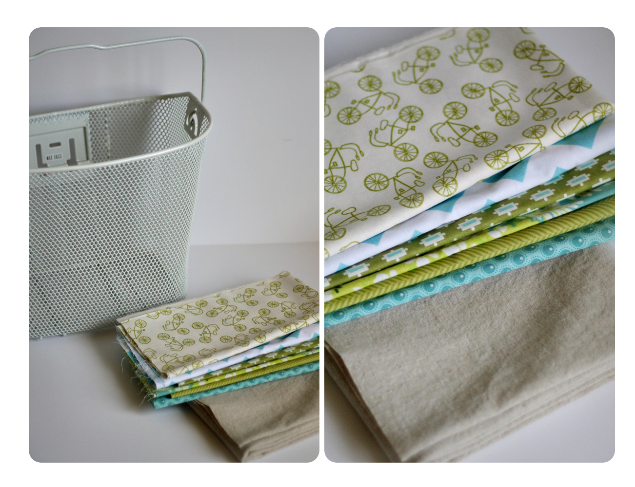 For my liner, I wanted to use several prints from my stash in colors that matched my bike {lime green + aqua}. You could easily do one or two fabric{s} for the entire liner. This can be as simple as you’d like.