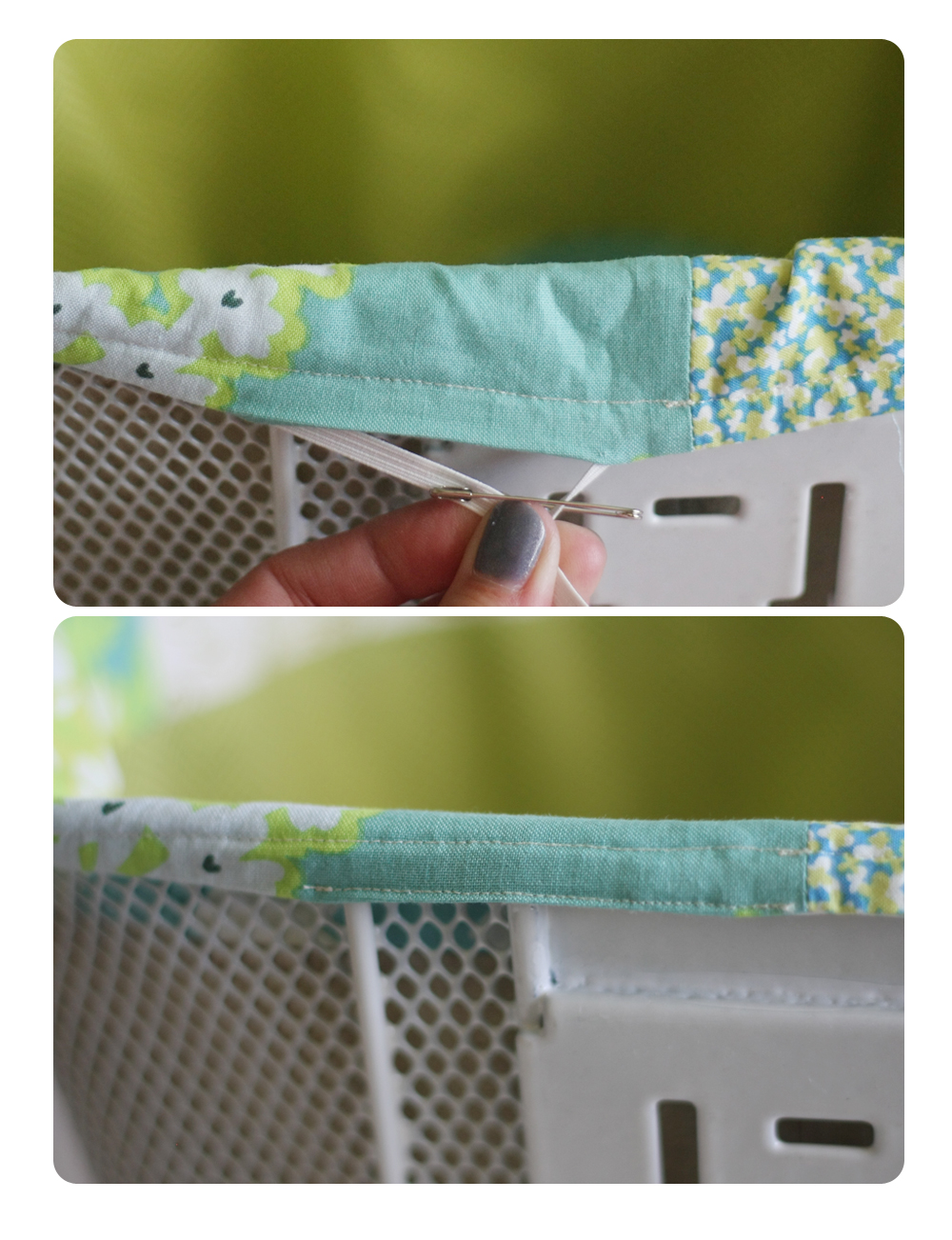 Place your lining inside your basket, fold down the top casing edge and stretch the elastic {you’ll have more than you need} to get a nice snug fit. Mark and cut the elastic where it should be sewn together. Overlap the two ends and stitch together using a zig zag stitch. Close opening by top stitching the two edges together.