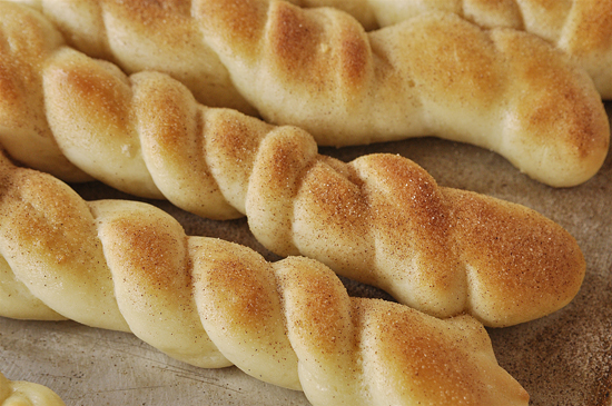 lovely recipe! I wanted more cinnamon sugar flavor and crunch, so I rolled the ropes in cinnamon sugar before twisting them up, brushed with butter before the oven, brushed with butter after the oven and dusted with another layer of cinnamon sugar. Yummy. :)