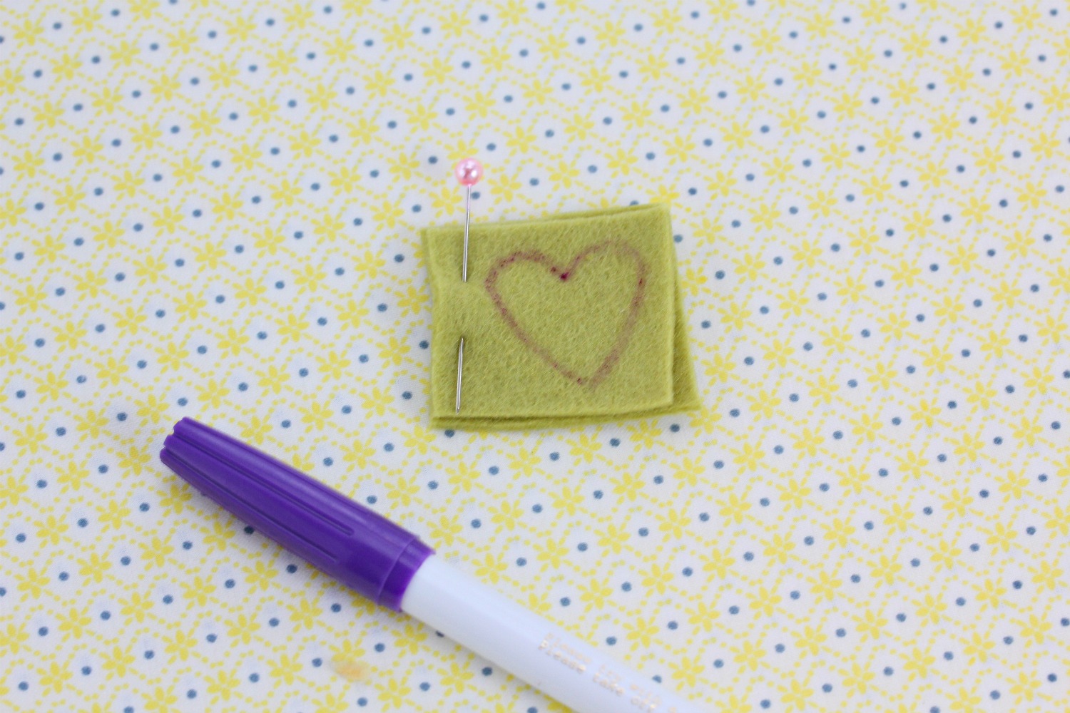 Start by drawing your shape onto felt. To help keep the felt in place while cutting, use a straight pin to stabilize the two pieces.