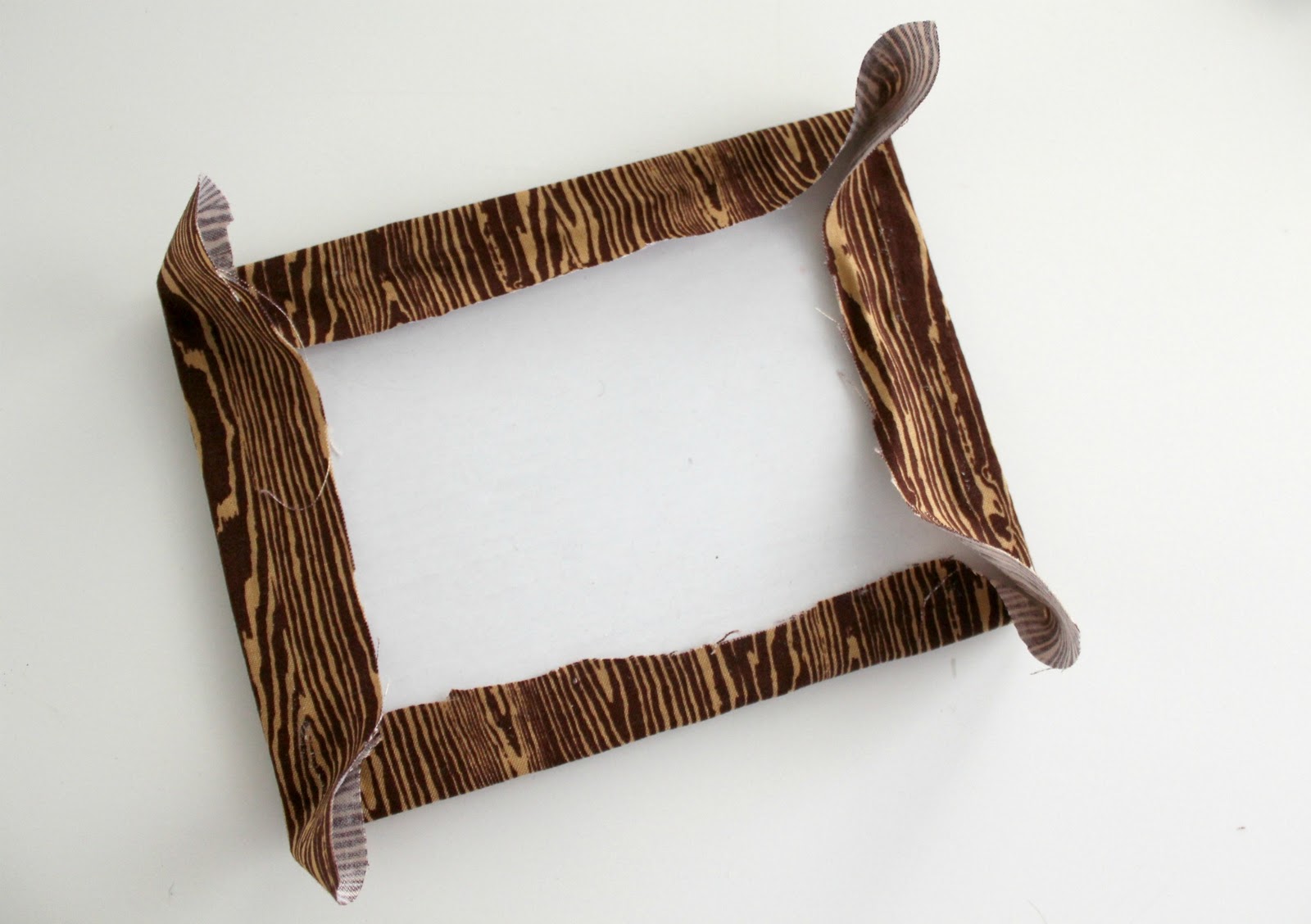 Cut a piece of cardboard the same size as the glass from your frame. Also cut a piece of fabric one inch bigger around than the glass in the frame. (I had a 5″ x 7″ frame so I cut my fabric to 7″ x 9″).