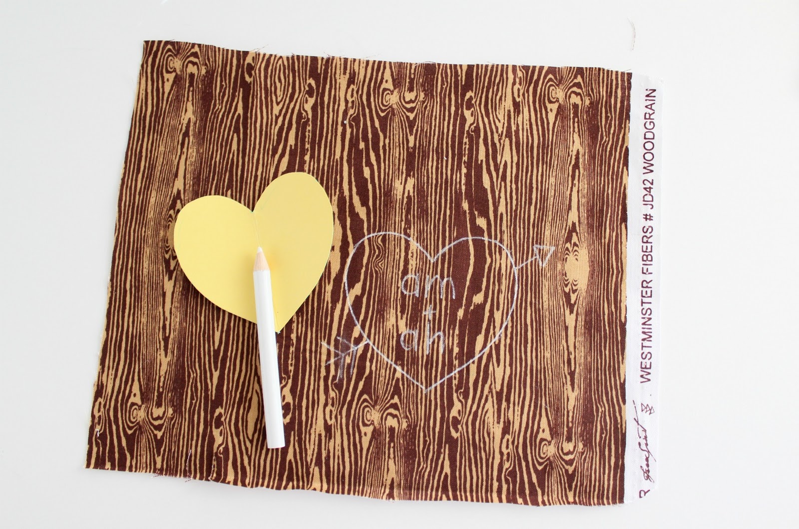 My “pattern” is a heart cut out of card stock. Fancy, huh? I just free handed the arrow and the initials. I used mine and my husband’s initials from before we got married. I could have used our initials now, but we have the same exact initials, even down to the middle name. I am pretty happy with myself, but I suppose “adm” + “adm” seems a bit self obsessed. ha!