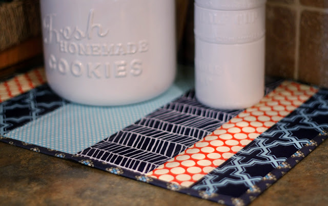 We don’t use placemats a ton in our house, but I do love using fabric ‘mats’ under things. For example, I’m using my new placemat under my cookie jar/measuring cups which tend to scratch the counter top as they get drug across it. Plus it just looks cute right?