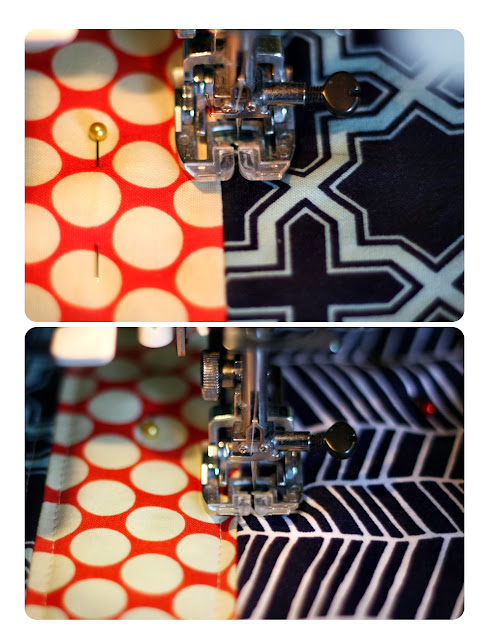 Using a straight stitch, increase your stitching to approx. 3.5. Using your presser foot as a guide, stitch 1/4 on each side of all {5} of your seams, back stitching at the beginning and end of each row. You will be stitching through all three layers {top, batting, bottom}. You may need to use a different color thread in your bobbin to match your back piece {I used cream on top and dark grey in my bobbin}.